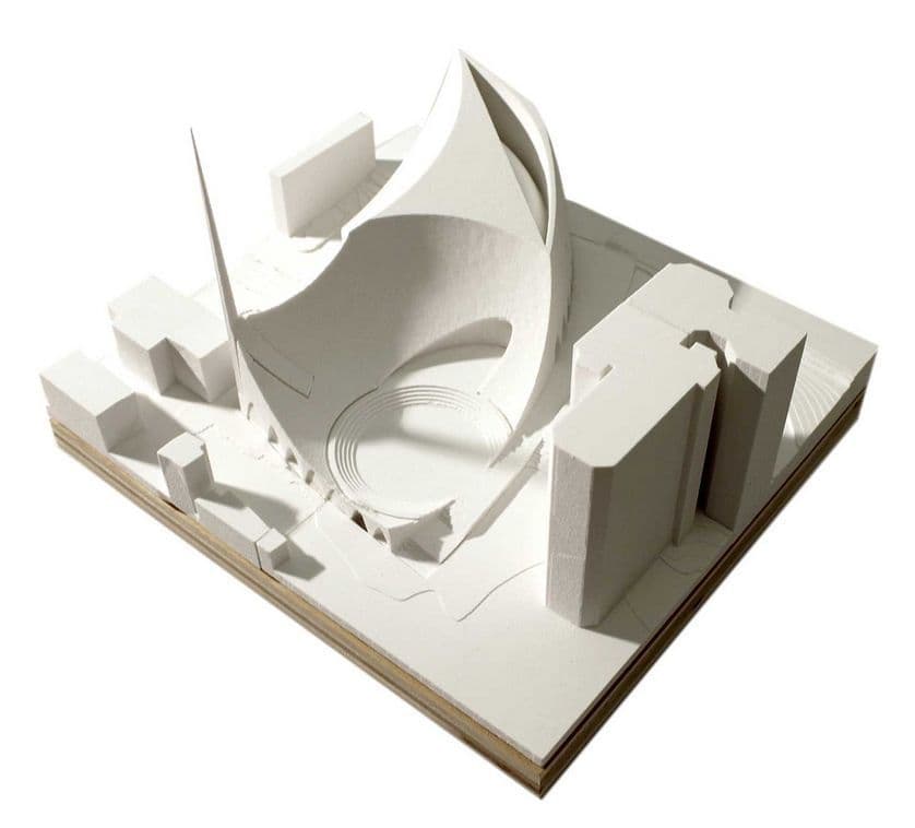 أحد أكثر التصاميم إثارة من حيث الشكل والمفهوم أيضاً، يقول المصمم أن الصلاة هى الشىء الذى يربط بين الأرض والسماء و تنتج عنها حركة روحانية تصعد من الأرض إلى السماء، والمسجد يشبه هذه الحركه حيث يسعى الجميع من شتى أنحاء المدينه إلى القبــله، أي من اقل نقطه إلى أعلى نقطه، ومن هنا خرج شكل المبنى من مستوى متدني إلى أعلى مستوى حيث المأذنه والقبلة معاً.