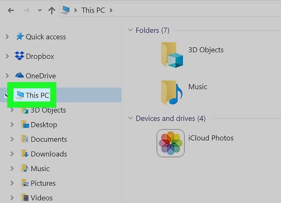- انقر على خيار "هذا الكمبيوتر الشخصي This PC"، الموجود في القسم الجانبي من النافذة وبجانبه أيقونة على شكل شاشة كمبيوتر، عندها ستظهر لك كافة الأقراص والمجلدات على الكمبيوتر.