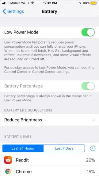 اذهب إلى الإعدادات ثم إلى البطارية واسحب زر تفعيل وضع الطاقة المنخفضة Low Power Mode،