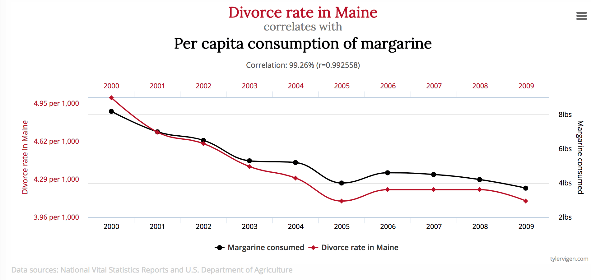 على سبيل المثال، هل تعلم بأن استهلاك الزبدة النباتية في الولايات المتحدة له ارتباط وثيق بمعدل الطلاق في ولاية Maine؟